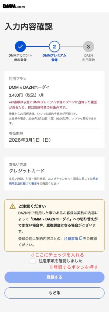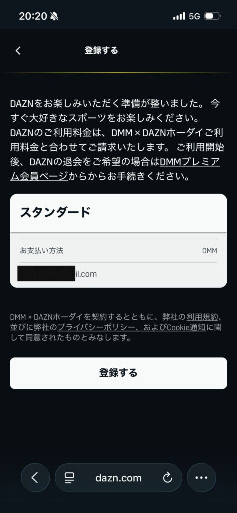 DAZN側の確認画面で、以下をチェックして「登録する」を押します。