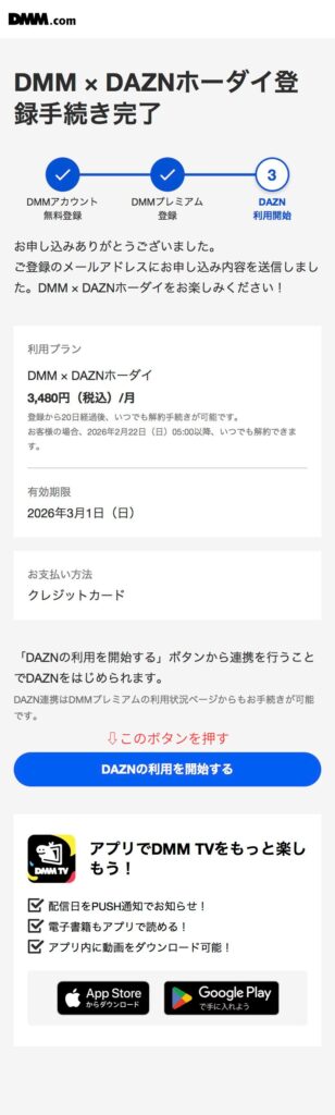 登録完了後に表示されるボタンから、DAZN連携へ進みます。